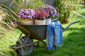 | Omschrijving | Herfstbloeiers in kruiwagen |
