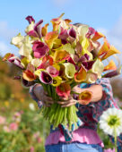 | Omschrijving | Dame met gemengd calla boeket |
